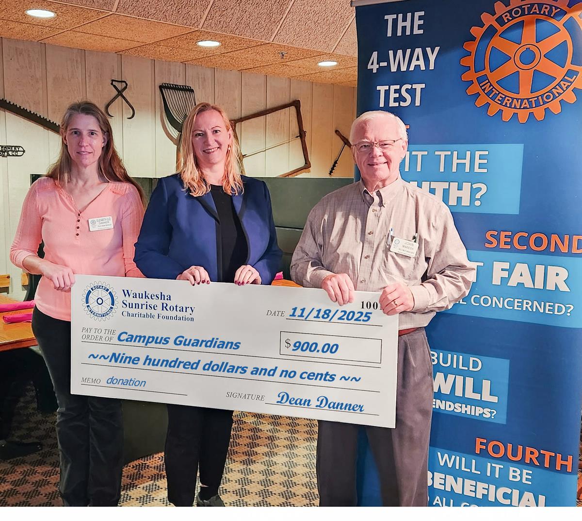 Elizabeth Danner and John Maresh proudly present Brook Teuber (middle) of Campus Guardians a $900 donation from the Waukesha Sunrise Rotary Charitable Foundation. This gift reflects Rotary’s commitment to truth, fairness, goodwill, and benefit to all — values highlighted in the Rotary 4‑Way Test banner.