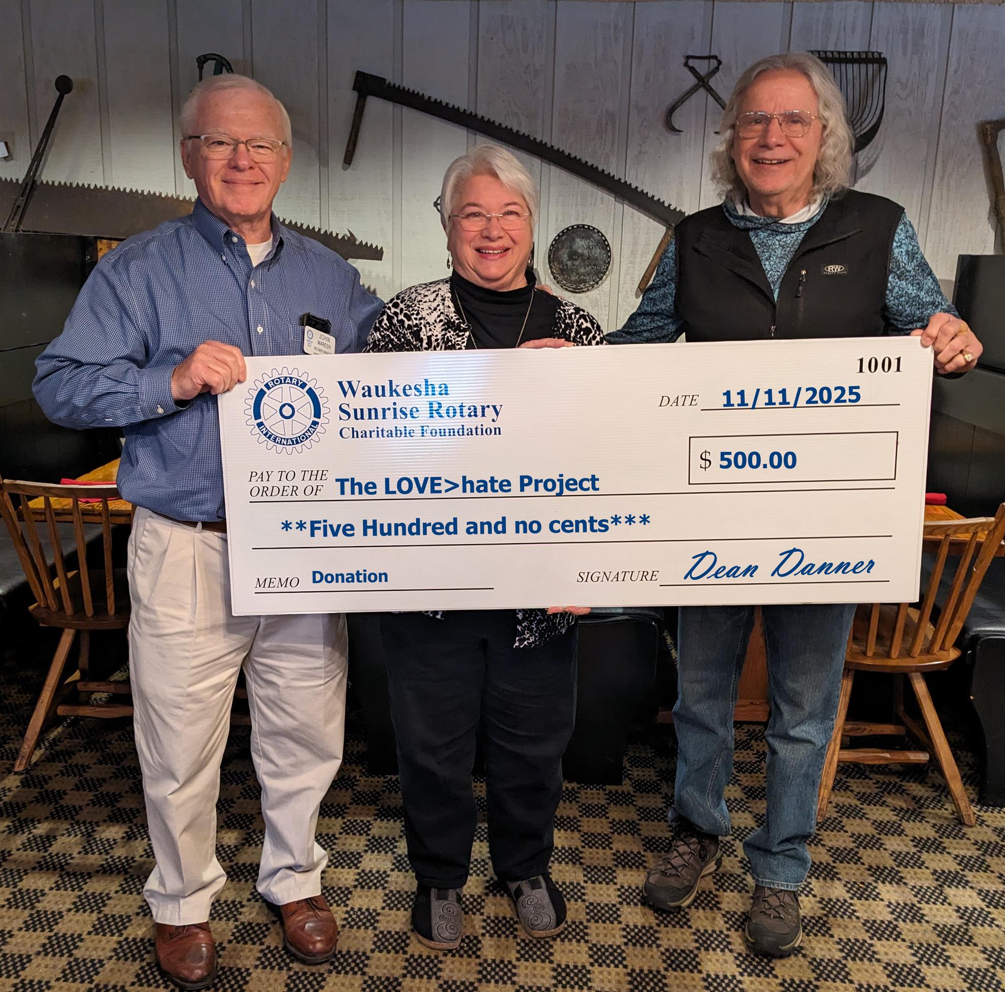 Pictured John M., Sara, and Steve Lirely of The Love>hate Project with a $500 donation supporting the mission.