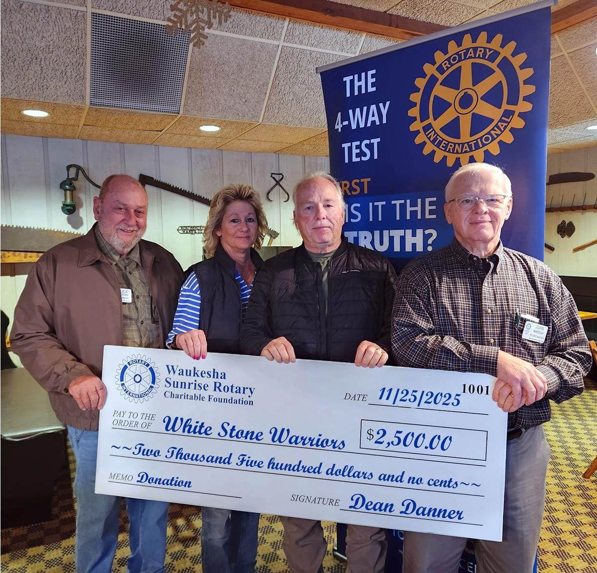 Waukesha Sunrise Rotary Charitable Foundation recently presented a $2,500 donation to White Stone Warriors, reinforcing our commitment to service and community impact. The funds will help White Stone Warriors continue their important work in uplifting and supporting those they serve.